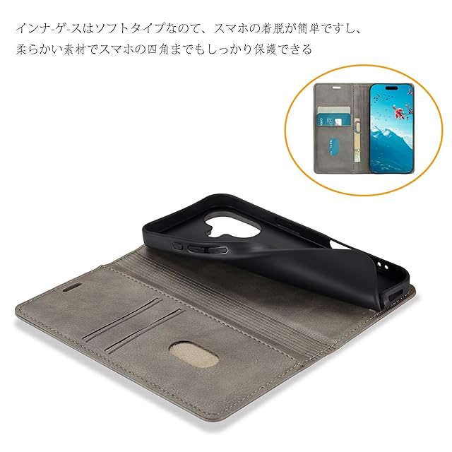 ・高品質のPUレザーを使用しており、柔らかく手触りが良いだけでなく、長時間の使用でも色落ちや劣化を防ぎ、天然皮革のような高級感と柔らかさを持ちながら、耐久性にも優れています。環境にも優しく、さらに耐水性や耐汚れ性も備えています。インナーケースは柔らかいソフトTPU素材を採用して、スマートフォンに完全にフィットするように設計されています。