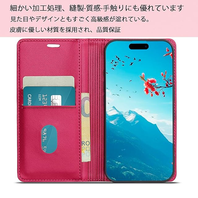 ・パール光沢のあるPUレザーを使用しており、柔らかく手触りが良いだけでなく、長時間の使用でも色落ちや劣化を防ぎ、天然皮革のような高級感と柔らかさを持ちながら、耐久性にも優れています。環境にも優しく、さらに耐水性や耐汚れ性も備えています。インナーケースは柔らかいソフトTPU素材を採用して、スマートフォンに完全にフィットするように設計されています。