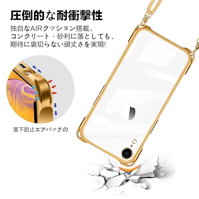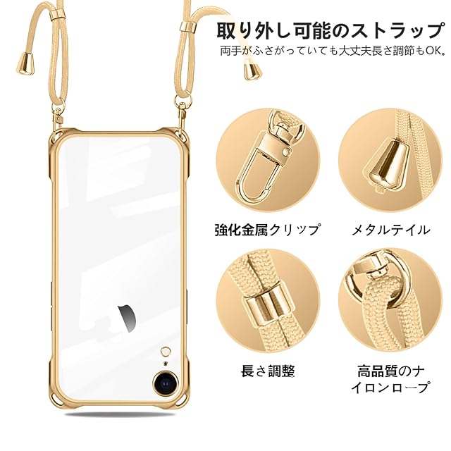 商品名:iPhone XR 用 ケース クリア ショルダー iphone xr 用 スマホケース アイフォンXR カバー 肩掛け 斜めかけ 縄掛けケース 透明 TPU 薄型 軽量 耐衝撃 紐付き 斜めがけ 織りストラップ付き ネックストラップ ショルダー ケース 縦/横 2WAY 長さ調整可能 取り外し可能 落下防止 紛失防止 ワイヤレス充電対応 (ゴールド)