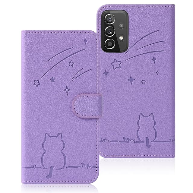 Rosbtib Galaxy A53 5G ケース 手帳型 ギャラクシーA53 5G ケース 手帳型 流れ星子猫 SC-53C ケース 可愛い 猫柄 ねこ SCG15 ケース galaxySC53D ケース 耐衝撃 Galaxy A53 スマホケース オシャレ 軽量 耐久性 スタンド機能 カード収納 PUレザー マグネット 着脱しやすい ギャラクシーsc53d カバー 6.5インチ対応(パープル)