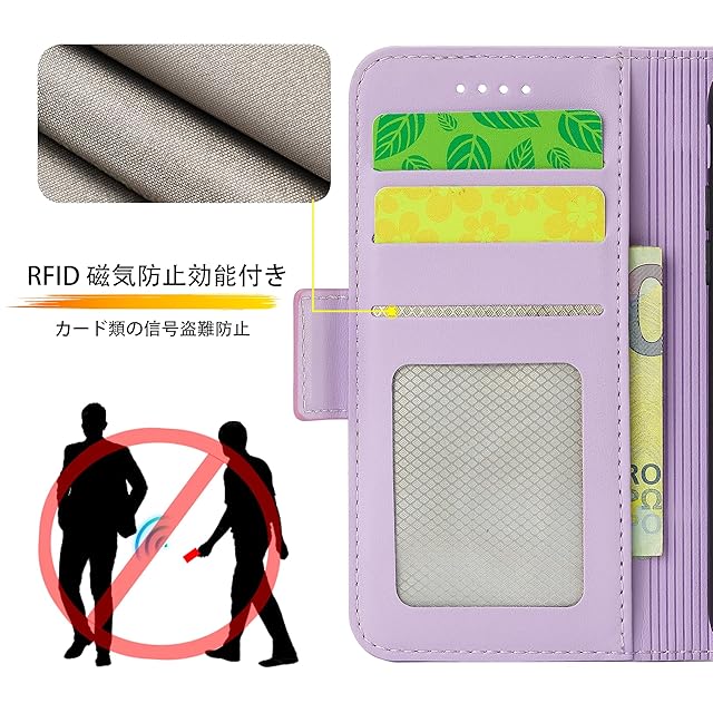 【RFID磁気防止 高品質レザー製】カードポケットにRFID設計加入し、カード類などの信号盗難防止でご財布をきちんとお守れ、使う時は十分安心できる。ケース 手帳型外部のカバーは肌感のような素材を採用しており、普通のレザーより、耐熱性と柔軟性を一層アップされ、素材の表面に手触りは非常に良いフィット感を与えられ、夏でも手汗で変な匂いが出てきてません。【使う便利性と優れた収納性】横置きスタンド機能付いて、ケースの背面から折り曲げて、横置きのスタントとして活用し、バランスよくスマホを支えて、読書や動画勿論、視聴ビデオ通話等でも効率がアップします。ケースの裏側にカードポケット3つ, 中に一つは透明で写真も入られ、側面には現金も少し収納することができます。 名刺や定期券の収納に優れていて、ちょっととしたお出かけてもこれで十分です;【サイドマグネット 全面保護】サイドマグネットの手帳型式で、カバーを閉める時、留め具生地の内側にマグネットが入れるので、片手で簡易に開閉することはできます。そして磁気カード収納する場合、携帯ペンを使う時、磁気を消せるとかの心配も要らないです。外側は高品質のPU製で、落下時の衝撃を効果的に吸収してスマホへの直接的な外力を防げるようになっています。内側は柔軟性あるTPUケースで、二重の保護として機能します。破損することはありません、衝撃から本体を各方向で360°保護します。