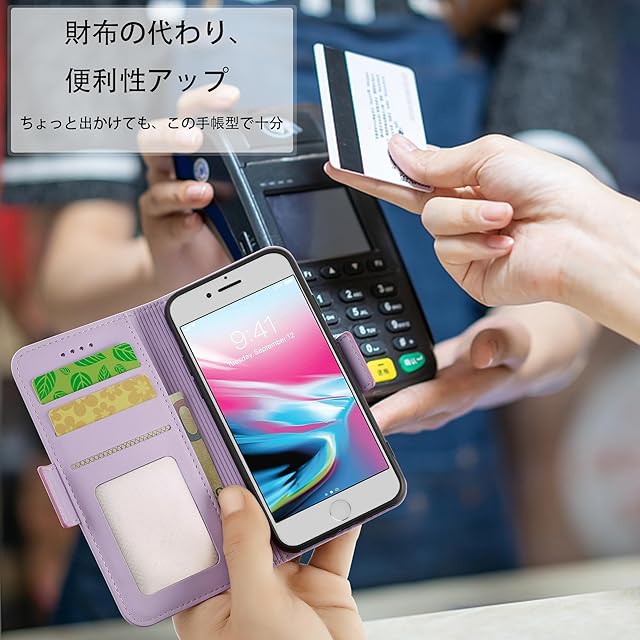 【使う便利性と優れた収納性】横置きスタンド機能付いて、ケースの背面から折り曲げて、横置きのスタントとして活用し、バランスよくスマホを支えて、読書や動画勿論、視聴ビデオ通話等でも効率がアップします。ケースの裏側にカードポケット3つ, 中に一つは透明で写真も入られ、側面には現金も少し収納することができます。 名刺や定期券の収納に優れていて、ちょっととしたお出かけてもこれで十分です;