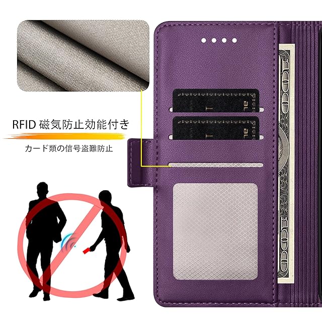 【RFID磁気防止 高品質レザー製】カードポケットにRFID設計加入し、カード類などの信号盗難防止でご財布をきちんとお守れ、使う時は十分安心できる。ケース 手帳型外部のカバーは肌感のような素材を採用しており、普通のレザーより、耐熱性と柔軟性を一層アップされ、素材の表面に手触りは非常に良いフィット感を与えられ、夏でも手汗で変な匂いが出てきてません。【使う便利性と優れた収納性】横置きスタンド機能付いて、ケースの背面から折り曲げて、横置きのスタントとして活用し、バランスよくスマホを支えて、読書や動画勿論、視聴ビデオ通話等でも効率がアップします。ケースの裏側にカードポケット3つ, 中に一つは透明で写真も入られ、側面には現金も少し収納することができます。 名刺や定期券の収納に優れていて、ちょっととしたお出かけてもこれで十分です;【サイドマグネット 全面保護】サイドマグネットの手帳型式で、カバーを閉める時、留め具生地の内側にマグネットが入れるので、片手で簡易に開閉することはできます。そして磁気カード収納する場合、携帯ペンを使う時、磁気を消せるとかの心配も要らないです。外側は高品質のPU製で、落下時の衝撃を効果的に吸収してスマホへの直接的な外力を防げるようになっています。内側は柔軟性あるTPUケースで、二重の保護として機能します。破損することはありません、衝撃から本体を各方向で360°保護します。