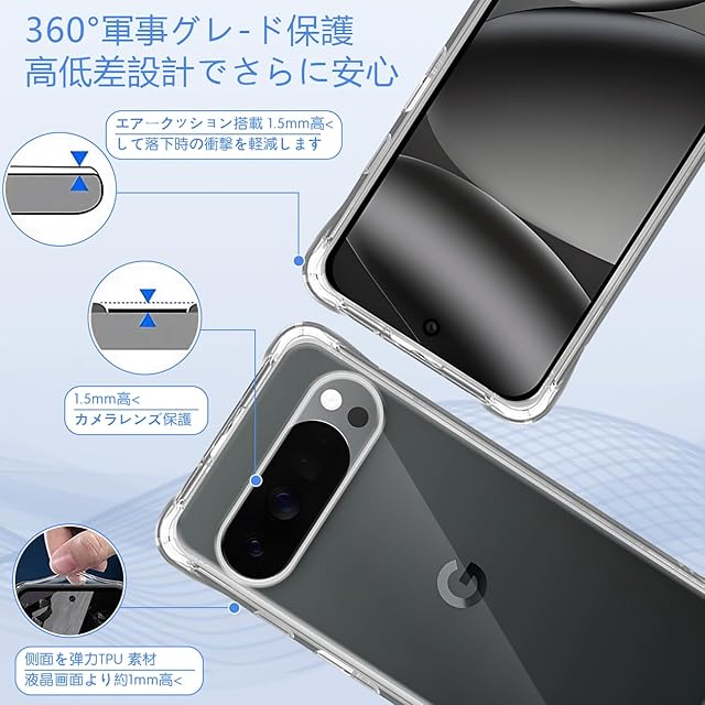 スマホが日常の生活に溶け込む現代で、落下などによるスマホの破損は販売台数に比例して増えている状況です。<br>本ケースの角には落下時の衝撃を吸収するエアポケットを備えており、万が一スマホを落としてしまった場合でも、落下時のダメージを最小限に抑えることが可能となっており、<br>その耐衝撃性能は第三者機関の試験による米軍MIL規格をクリアするほど高いことが証明されております。<br>また、ピクセル10 Pro XL 専用にオリジナル設計しているためぴったりとフィットし、保護性能には欠かせないポイントとなっています。 <br><b>【高設計】</b> <br>対応 Pixel 10 Pro XL 本体にぴったりフィイットするよう設計し、精巧をきわめていることの孔位で。<br> 着脱も簡単で、スマホ本体への擦り傷も心配無用です。内側のマイクロファイバーライニングクロスは非常に柔らかく、電話の裏面を傷つけません。 <br><b>【高品質】</b> <br>高品質のTPU素材を採用して、磨耗に耐え、滑り止め防塵、分裂防止などの全面の保護を提供します。<br>落ちることでもたらす衝撃力を吸収できるから、壊されないケースである。 <br><b>【高い透明度】</b> <br>背面に高透明度と指紋軽減を両立した特殊TPU素材を採用、透明背面は黄ばまず。透明度が高く、本体の鮮やかな色をそのまま映し出すことができ、 スマートフォン のオリジナルのカラーを損ねません。<br>驚きほどの透明感、美しさをしっかりキープ、携帯電話本体のカラーを活かせて、背面がクリアなので好きなシールや写真を入れてカスタマイズOK、本体の美しさを引き立たせて。 <br><b>【100%安心な】</b> <br>弊社は安心交換が付きます。品物はお客様の手元に届いたら、割れたり、傷など付いていたり、<br>または通常使用で問題があると思われる場合は弊社とご連絡ください。迅速に対応し、満足のいく回答をいたします。