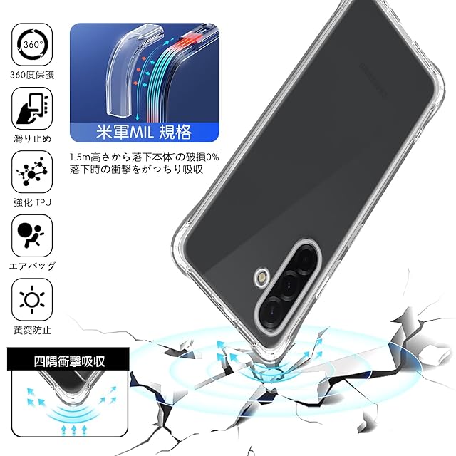 スマホが日常の生活に溶け込む現代で、落下などによるスマホの破損は販売台数に比例して増えている状況です。<br>本ケースの角には落下時の衝撃を吸収するエアポケットを備えており、万が一スマホを落としてしまった場合でも、落下時のダメージを最小限に抑えることが可能となっており、<br>その耐衝撃性能は第三者機関の試験による米軍MIL規格をクリアするほど高いことが証明されております。<br>また、ギャラクシー A36 専用にオリジナル設計しているためぴったりとフィットし、保護性能には欠かせないポイントとなっています。 <br><b>【高設計】</b> <br>対応 Galaxy A36 本体にぴったりフィイットするよう設計し、精巧をきわめていることの孔位で。<br> 着脱も簡単で、スマホ本体への擦り傷も心配無用です。内側のマイクロファイバーライニングクロスは非常に柔らかく、電話の裏面を傷つけません。 <br><b>【高品質】</b> <br>高品質のTPU素材を採用して、磨耗に耐え、滑り止め防塵、分裂防止などの全面の保護を提供します。<br>落ちることでもたらす衝撃力を吸収できるから、壊されないケースである。 <br><b>【高い透明度】</b> <br>背面に高透明度と指紋軽減を両立した特殊TPU素材を採用、透明背面は黄ばまず。透明度が高く、本体の鮮やかな色をそのまま映し出すことができ、 スマートフォン のオリジナルのカラーを損ねません。<br>驚きほどの透明感、美しさをしっかりキープ、携帯電話本体のカラーを活かせて、背面がクリアなので好きなシールや写真を入れてカスタマイズOK、本体の美しさを引き立たせて。 <br><b>【100%安心な】</b> <br>弊社は安心交換が付きます。品物はお客様の手元に届いたら、割れたり、傷など付いていたり、<br>または通常使用で問題があると思われる場合は弊社とご連絡ください。迅速に対応し、満足のいく回答をいたします。