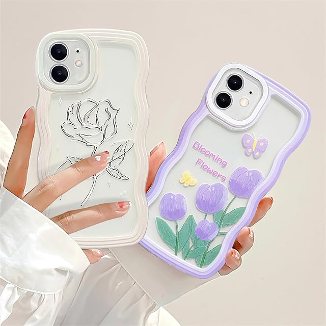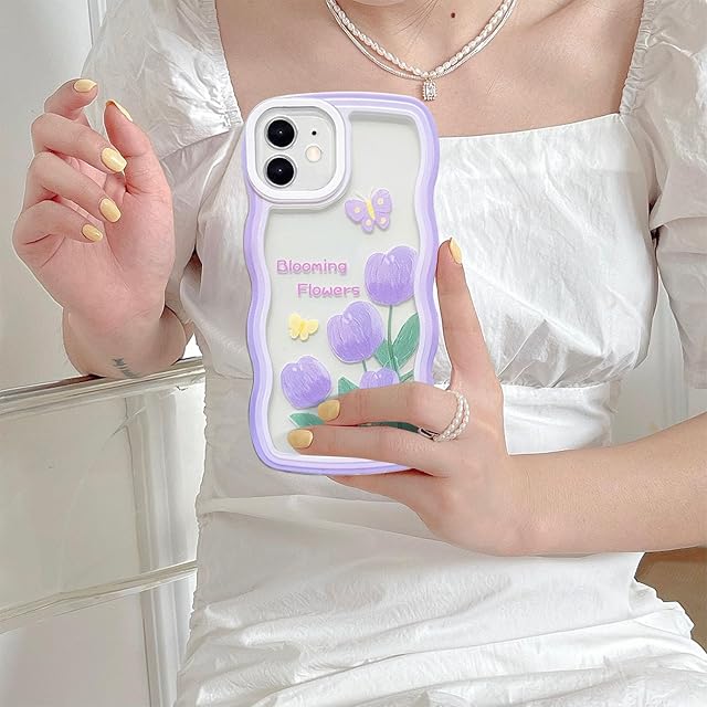 UEEBAI 対応 iPhone 12 6.1 inch 用の ケース ソフト TPU カバー 可愛い おしゃれケース 透明 ウェーブ デザイン スマホケース ワイヤレス充電対応 軽量 薄型 耐衝撃 人気 波型 バンパー スマホケース-パープル・フラワー