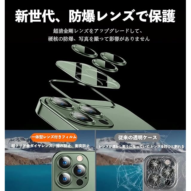 【レンズフィルム付き】一体式保護ケース、全包レンズ、剃り防止、転倒防止、黄色くならない、メッキ工芸精彫細琢