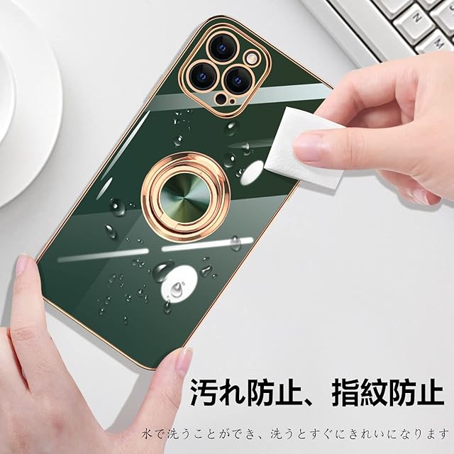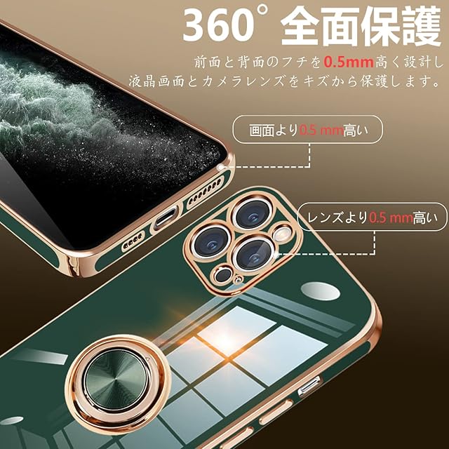 商品名:iPhone12 Pro Max ケース リング付き アイフォン12promax リング カバー 耐衝撃 TPU メッキ加工 360°回転 スタンド機能 車載ホルダー ストラップホール付き 6.7インチ(ダークグリーン)