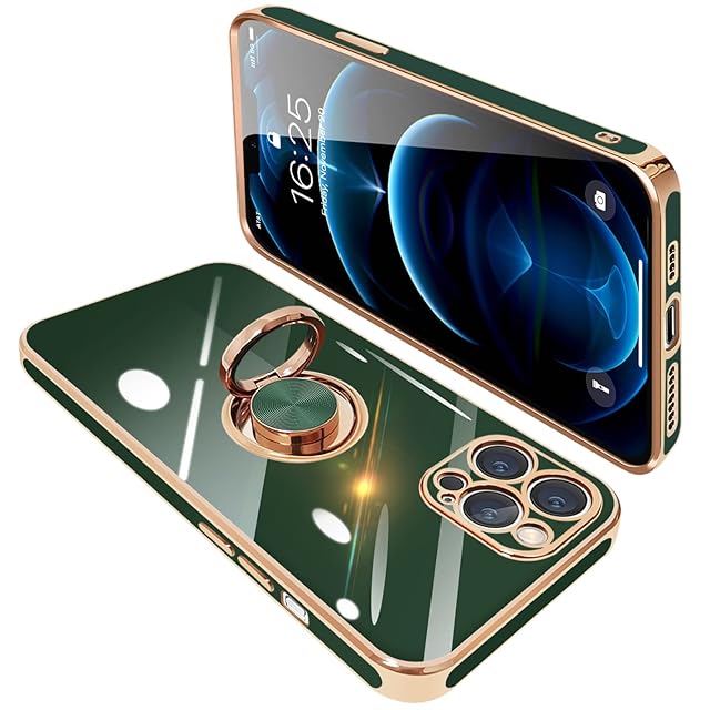 iPhone12 Pro Max ケース リング付き アイフォン12promax リング カバー 耐衝撃 TPU メッキ加工 360°回転 スタンド機能 車載ホルダー ストラップホール付き 6.7インチ(ダークグリーン)