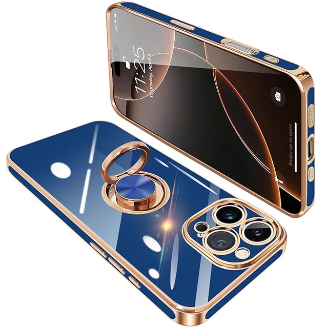iPhone16 Pro ケース リング付き アイフォン16Pro リング カバー 耐衝撃 TPU 360°回転 スタンド機能 メッキ加工 車載ホルダー ストラップホール付き 6.3インチ(ブルー)