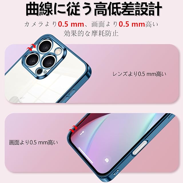 【カメラ、液晶画面は浮かせて保護】スマホを机などの平面に置いた場合に、液晶画面やカメラレンズが接触してできるキズが最小限に抑えられるよう、表側(液晶画面側)は0.5mmの、裏側(背面側)は0.5mmの高低差をつけ、浮かせることで傷や摩擦からガードします。