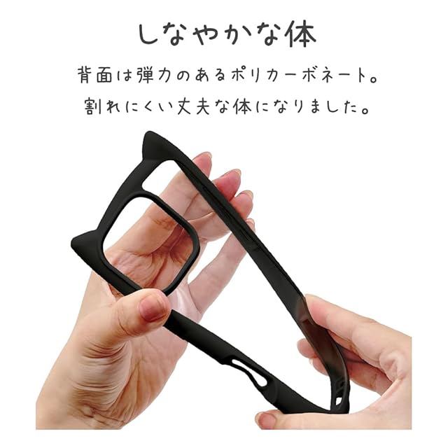 本製品はかわいい猫耳が付いたハイブリッド背面ケースです。 米軍MIL規格「MIL-STD-810H」最新の衝撃基準規格に準拠。 アメリカ国防総省で定められた、米軍調達品基準に準拠した規格で、26方向からの落下試験に耐えた衝撃吸収ケースです。 側面は弾力と柔軟性を兼ね備えたTPU素材で端末を衝撃から保護。背面は傷に強いポリカーボネート素材を使用しています。 ※衝撃吸収については、一般的なポリカーボネート製ケースと比較した自社検証結果で、無破損、無故障をするものではありません。 保護性能と装着感を追求した約1.5mmの厚めのデザイン。 側面にやわらかい素材を使用しているため着脱が簡単です。 チャーム等を取り付けることが可能なストラップホール付き。 ※本製品のストラップホールを使用する場合は、ストラップのみで宙吊りにするご使用方法はお止めください。 ケースから機器本体が外れて落下し破損や損傷等の原因となります。 ケースを装着したままカメラ機能や充電コネクターの接続、タッチパネル操作が可能です。 また各種ボタンの操作も使用可能です。MagSafeアクセサリーには対応しておりません。 ※本製品は液晶ガラスの外周まで覆う形状の為、保護フィルム等の形状によっては浮く、もしくは剥がれてしまう場合があります。 対応ガラス・フィルムをご使用の際はご注意ください。 ※ご使用のモニター環境により、実際の商品の色合いと多少異なってみえる場合がございますのでご了承ください。 ※商品及びパッケージは改良などの諸事情により予告なく変更することがあります。