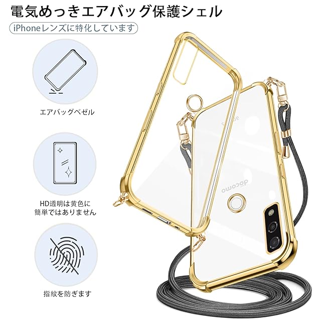 商品名:Arrows We F-51B ケース クリアショルダー Arrows We スマホケース Arrows We FCG01 カバー 耐衝撃 薄型 TPU 軽量 肩がけ 首掛け 紐付きバンパー カバー ストラップ付き ストラップホール付き 韓国 透明 ストラップ着脱可 調節 Qi充電 ワイヤレス充電 傷防止 全面(ゴールド)