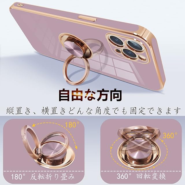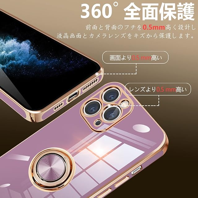 商品名:iPhone11 pro ケース リング付き アイフォン11pro リング カバー 耐衝撃 TPU メッキ加工 360°回転 スタンド機能 車載ホルダー ストラップホール付き 5.8インチ(パープル)