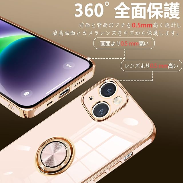 商品名:iPhone14 ケース リング付き アイフォン14 リング カバー 耐衝撃 TPU 360°回転 スタンド機能 メッキ加工 車載ホルダー ストラップホール付き 6.1インチ(ピンク)