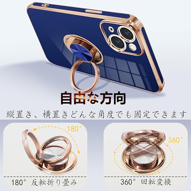 商品名:iPhone15 Plus ケース リング付き アイフォン15Plus リング カバー 耐衝撃 TPU 360°回転 スタンド機能 メッキ加工 車載ホルダー ストラップホール付き 6.7インチ(ブルー)