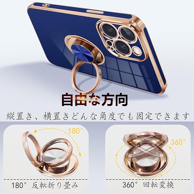 ONETIAOLONG iPhone 15 Pro ケース リング付き アイフォン15Pro リング カバー 耐衝撃 TPU 360°回転 スタンド機能 メッキ加工 車載ホルダー ストラップホール付き 6.1インチ(ブルー)