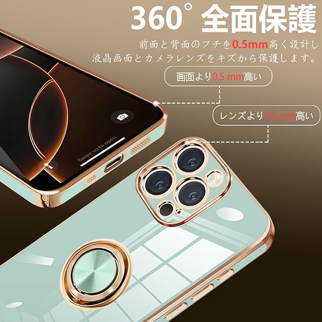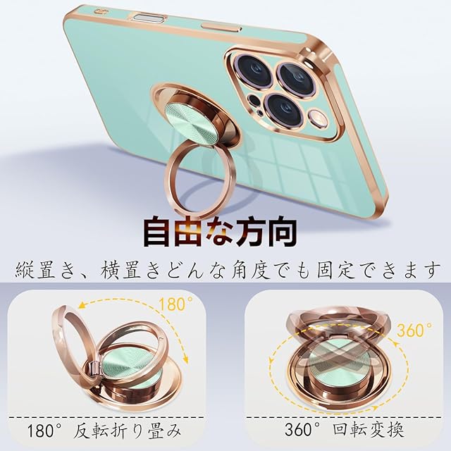 商品名:iPhone16 Pro ケース リング付き アイフォン16Pro リング カバー 耐衝撃 TPU 360°回転 スタンド機能 メッキ加工 車載ホルダー ストラップホール付き 6.3インチ(ライトシアン)