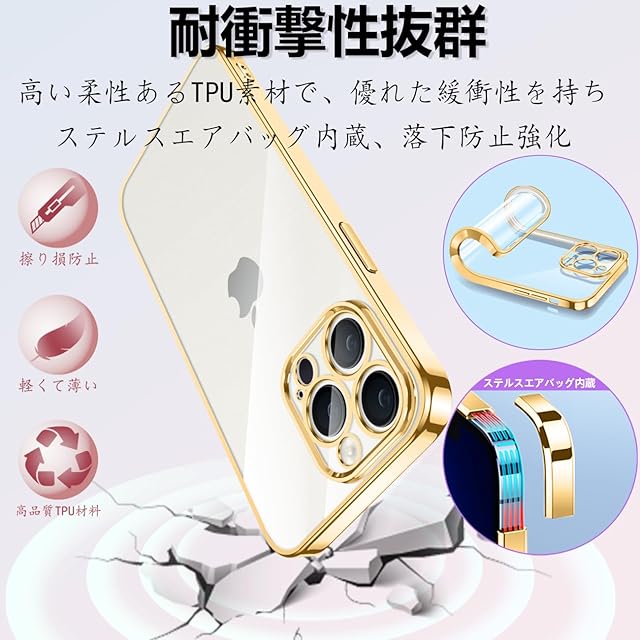 Montue iPhone 15 Pro 用 ケース クリア 耐衝撃 米軍MIL規格 可愛い 韓国 薄型 軽量 スマホケース アイフォン15 Pro 用 カバー ワイヤレス充電対応 (ゴールド)