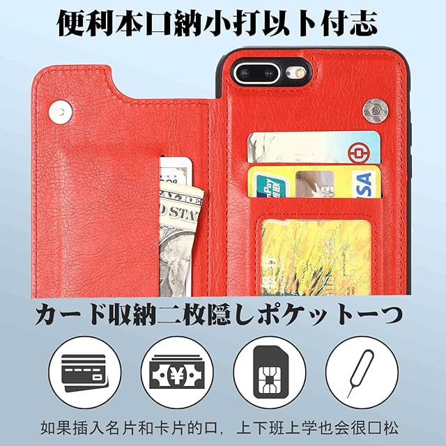 【Aqier】For iPhone 8 plus/Apple iPhone 7 plus ケース 背面手帳型 軽い薄い 純色 レザーケース(レッド)アイフォン 8プラス アイフォン7プラス ケースカード入れ 片手操作 バックカバー アップル アイフォン7p 赤色