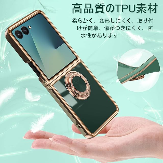 商品名:[ZoRoll] Samsung Galaxy Z Flip 7 対応 ケース リング付き、カバー スマホケース Galaxy Z Flip 7 TPU シリコン メッキ加工ケース、磁気吸着 軽量 薄型 人気 耐衝撃 タンド機能付き 360回転 車載ホルダー対応 サムスン ギャラクシーZ Flip7 用 カバー (ダークグリーン)