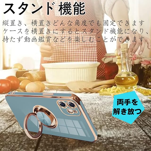 商品名:iPhone 12 ケース リング付き 耐衝撃 iphone12 リング スマホケース カバー 米軍MIL規格取得 スタンド機能付き TPU 360回転車載ホルダー(グレーブルー)