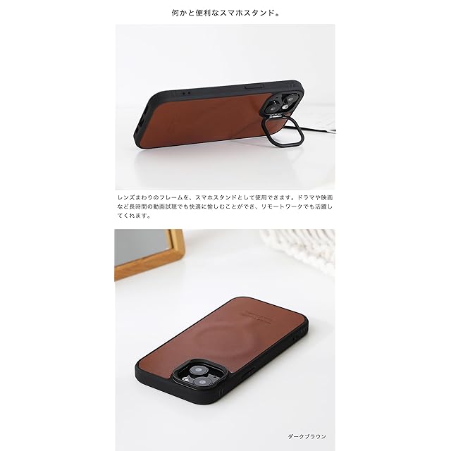 【仕様】ケース背面にMagSafe用マグネットリングが内蔵されているので、MagSafe充電器やMagSafe対応アクセサリーを装着することが可能です。ケース本体は耐候性や耐熱性に優れたポリカーボネートを採用し、高品質の素材でスマートフォン本体をしっかり保護しています。側面はスムーズに着脱ができるシリコンでボタンを覆うフルカバーの仕様になっており、下部にストラップホールが付いています。※丸ひもタイプのストラップ付属(カラーはブラック) 背面は栃木レザーを丁寧に貼り込み仕上げています。 【スタンド機能】レンズまわりのフレームをスマホスタンドとして使用できます。※カメラホールにスタンド機能付きのフレームを付けているので、カメラホールの形状は機種に関わらず正方形となっております。