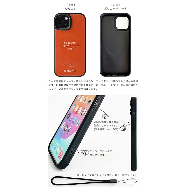ご注文をいただいてから製作しております。<br>■素材 ケース背面 : 牛革 栃木レザー(牛皮を天然の植物由来のタンニンなめしを施した皮革) 本体(内側) : PC(ポリカーボネート) 本体(側面) : シリコン(ブラック)<br>■栃木レザー : 伝統的なピット製法で植物タンニンなめしにこだわって製造している皮革メーカー(タンナー)です。南米産のミモザの樹皮から抽出されたタンニン剤でじっくり時間をかけてなめしあげた純正ヌメ革です。<br>■バラキズ・ムラ・ホクロ・毛穴・チスジ・シワ(トラ)・かさぶたの痕など、革の個性による返品・交換はお受けできません。また、ご注文時に革の状態をお選びいただくことはできません。<br>■ポリカーボネートは耐候性や耐熱性に優れた性質を持ち、ソフトコーティング処理が施されているので脱着時にスマートフォンに傷がつきにくくなっています。<br>■カメラホールやマイクスピーカー等は対応機種に合わせて開けておりますので、ケースを装着したまま撮影・充電(卓上ホルダーでの充電不可)が可能です。<br>■下部にストラップホール付き ※丸ひもタイプのストラップを付属しています。<br>■画像はサンプルです。1点1点手作りのため、製作過程での傷汚れや画像との細かな違いなどがある場合がございます。<br>■光の加減(太陽光下と蛍光灯下)で色の鮮やかさが異なります。また、ご使用されているパソコンのモニターや、携帯電話のメーカー・機種・画面設定等により、実際の商品の色と異なって見える場合がございます。<br>■予告なく素材が変更になる場合がございます。予めご了承ください。<br>■ケースのみの販売となりスマートフォン本体やMagSafe充電器・MagSafe対応アクセサリーはついておりません。<br>■韓国製<br>■ご注文確定前に、必ず[対応機種]をご確認ください。