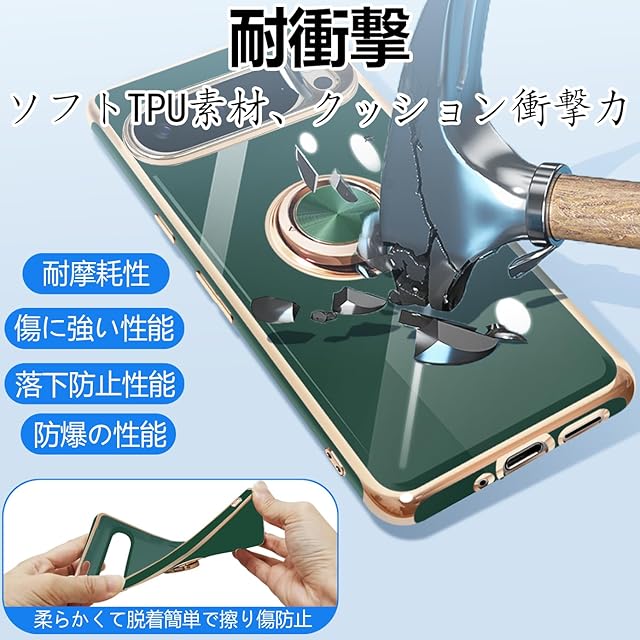 商品名:Google Pixel9 Pro XL ケース リング付き グーグル ピクセル 9ProXL リング カバー 耐衝撃 TPU メッキ加工 360°回転 スタンド機能 車載ホルダー ストラップホール付き(ダークグリーン)