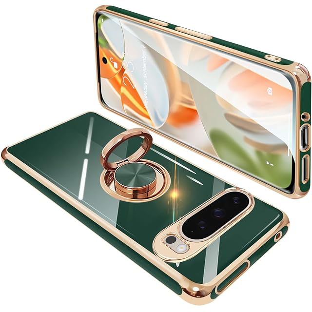 Google Pixel9 Pro XL ケース リング付き グーグル ピクセル 9ProXL リング カバー 耐衝撃 TPU メッキ加工 360°回転 スタンド機能 車載ホルダー ストラップホール付き(ダークグリーン)