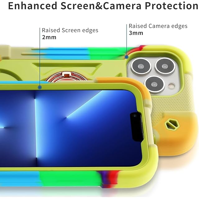 商品名:PboyiqiS For iPhone 16 Plus ケース 耐衝撃 頑丈 360度回転スタンド リング付き付き 虹色 かわいい アイフォン16 Plus マックス ケース 車載ホルダー対応 落下防止 ストラップホール付き アウトドア 子供 仕事用 (虹色黄, iPhone 16 Plus)