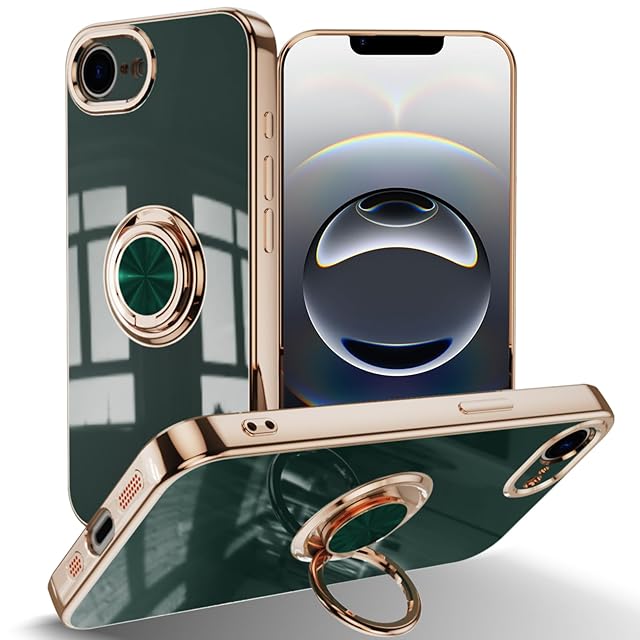 [ZoRoll] iPhone 16e 対応 ケース リング付き、カバー スマホケース アイフォン 16e TPU シリコン メッキ加工カバー 磁気吸着 軽量 薄型 人気 耐衝撃 タンド機能付き 360回転 車載ホルダー対応 あいふぉん16E 用 カバー (ダークグリーン)