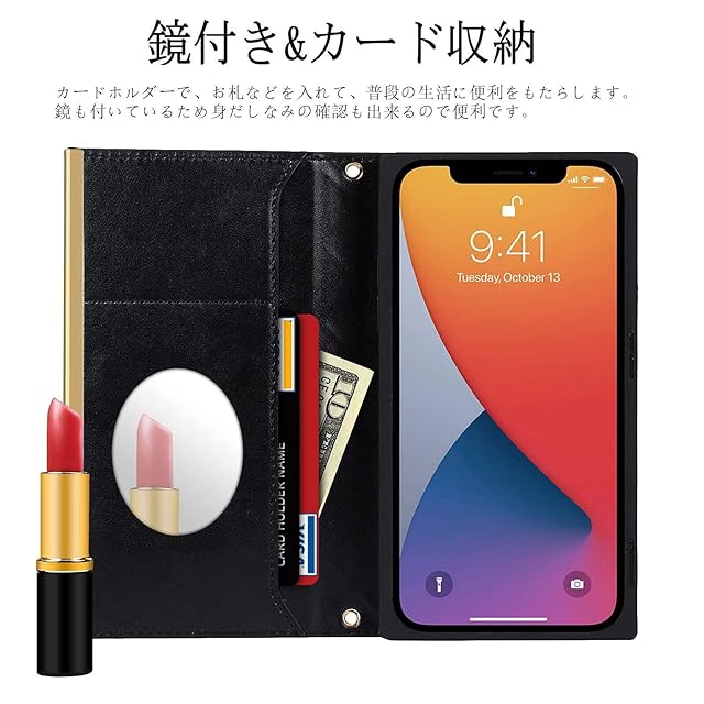 【カード収納&ミラー付き】①カード入れポケットが付いてカードや名刺やお札などを入れることができます。抜群な収納機能!ちょっとしたお出かけに便利です。通勤通学も楽々です。②ミラー付き : 手帳型ケースの内側にはミニミラーがデザインされています。だからメイクをチェックしたり、お化粧を直したり、食事後のオーラルチェックに最適。商品は携帯ケースのみで、口紅は含まれていません。