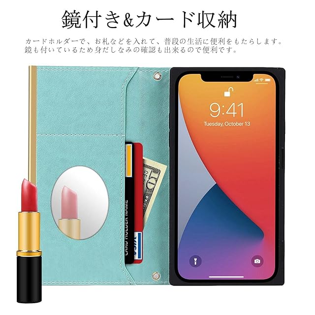 【カード収納&ミラー付き】①カード入れポケットが付いてカードや名刺やお札などを入れることができます。抜群な収納機能!ちょっとしたお出かけに便利です。通勤通学も楽々です。②ミラー付き : 手帳型ケースの内側にはミニミラーがデザインされています。だからメイクをチェックしたり、お化粧を直したり、食事後のオーラルチェックに最適。商品は携帯ケースのみで、口紅は含まれていません。