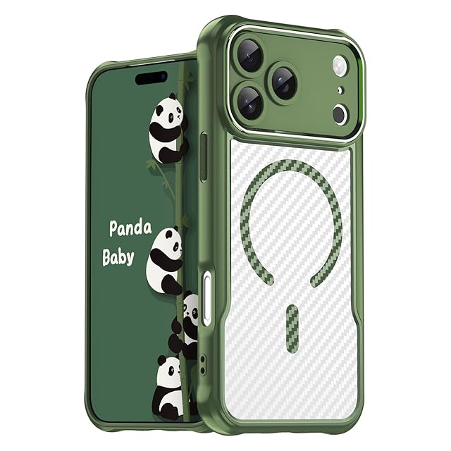 Panda Baby iPhone 17 Pro 用 ケース MagSafe対応 半透明 マット質感 指紋防止 耐衝撃バンパー マグネット搭載 レンズ全面保護 「おしゃれなカーボン調」 (グリーン)