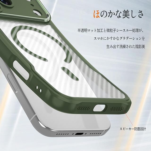 半透明ケース、カーボン調、MagSafe対応カバー、耐衝撃バンパー、本革より耐久性に優れ、色合い、光沢感、質感、肌触りなどから見て、高級感と落ち着きを溢れています。