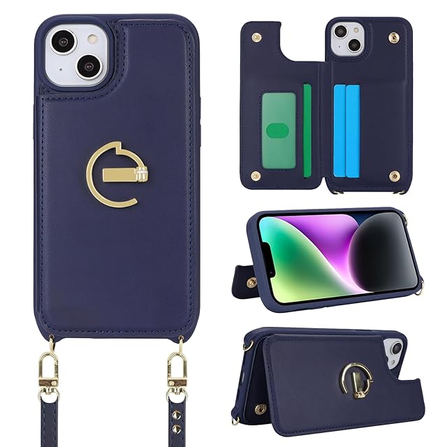 Havaya スマホショルダー iPhone15ケース iphone 15 ケース スマホケースiphone15 ショルダー リング付き レザー 肩掛け カード収納(アイフォン15 /あいふぉん15/いphone15/アイホン15 6.1インチ対応)-ブルー