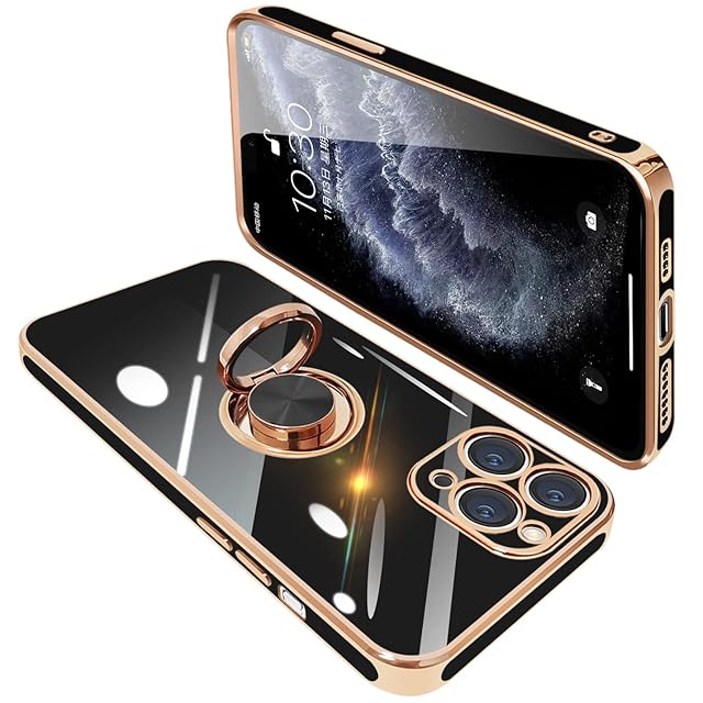 iPhone11 Pro Max ケース リング付き アイフォン11promax リング カバー 耐衝撃 TPU メッキ加工 360°回転 スタンド機能 車載ホルダー ストラップホール付き 6.5インチ(ブラック)