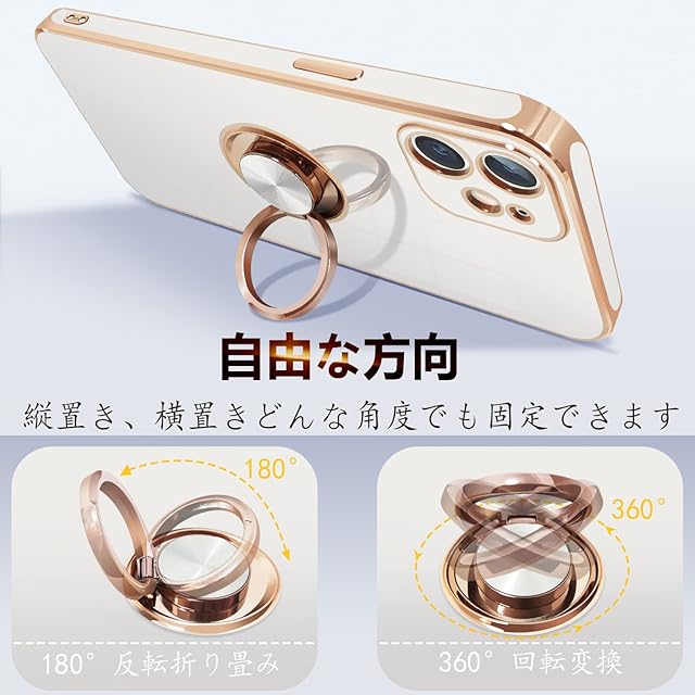 iPhone12 Mini ケース リング付き アイフォン12Mini リング カバー 耐衝撃 TPU メッキ加工 360°回転 スタンド機能 車載ホルダー ストラップホール付き 5.4インチ(ホワイト)