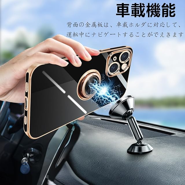 商品名:iPhone15 ケース リング付き アイフォン15 リング カバー 耐衝撃 TPU 360°回転 スタンド機能 メッキ加工 車載ホルダー ストラップホール付き 6.1インチ(ブラック)