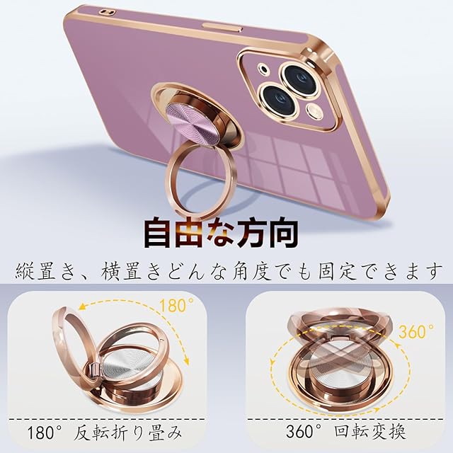 商品名:iPhone15 Plus ケース リング付き アイフォン15Plus リング カバー 耐衝撃 TPU 360°回転 スタンド機能 メッキ加工 車載ホルダー ストラップホール付き 6.7インチ(パープル)