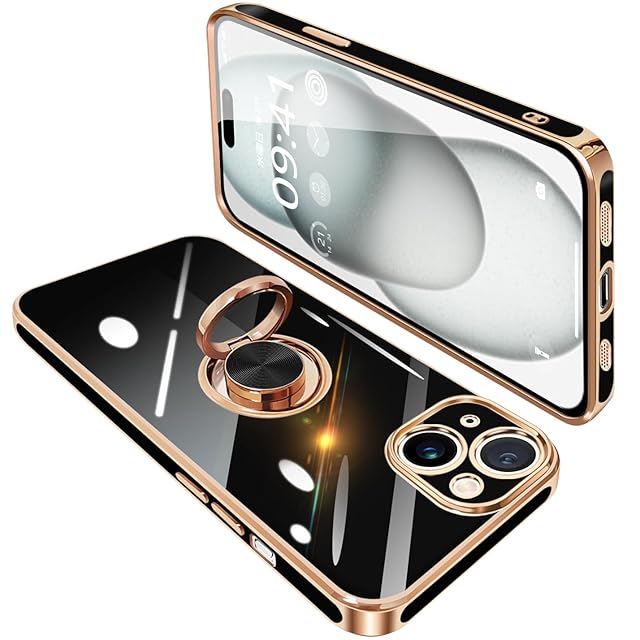 iPhone15 Plus ケース リング付き アイフォン15Plus リング カバー 耐衝撃 TPU 360°回転 スタンド機能 メッキ加工 車載ホルダー ストラップホール付き 6.7インチ(ブラック)