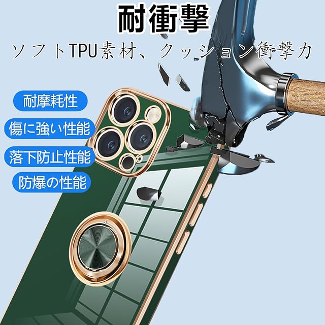 商品名:iPhone15 Pro Max ケース リング付き アイフォン15ProMax リング カバー 耐衝撃 TPU 360°回転 スタンド機能 メッキ加工 車載ホルダー ストラップホール付き 6.7インチ(ダークグリーン)