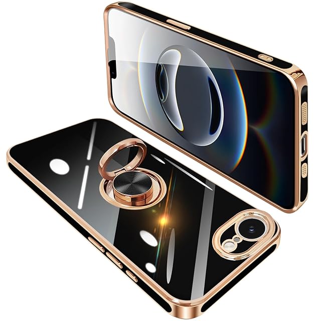 iPhone 16e ケース リング付き アイフォン16e リング カバー 耐衝撃 TPU 360°回転 スタンド機能 メッキ加工 車載ホルダー ストラップホール付き 6.1インチ(ブラック)