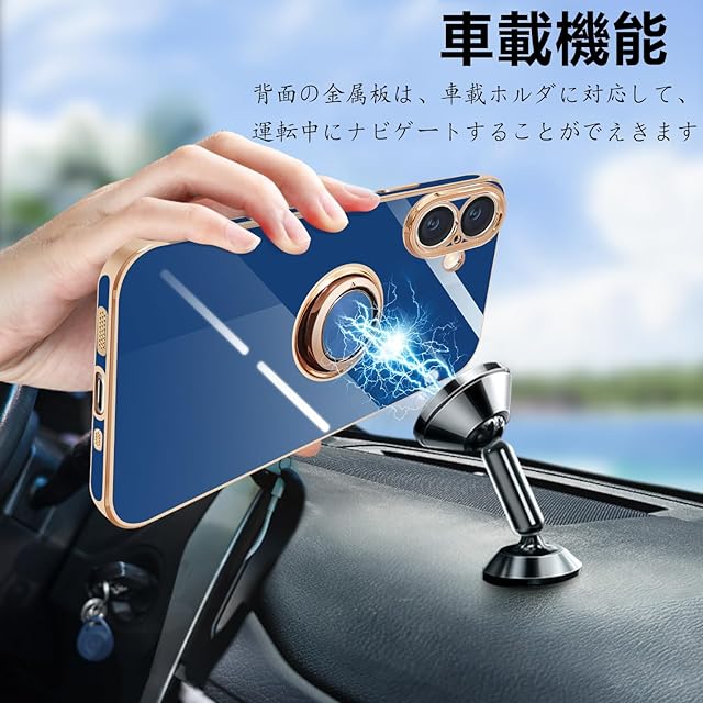 商品名:ONETIAOLONG iPhone17 用の ケース リング付き アイフォン17 用の リング カバー 耐衝撃 TPU 360°回転 スタンド機能 メッキ加工 車載ホルダー ストラップホール付き 6.3インチ(ブルー)
