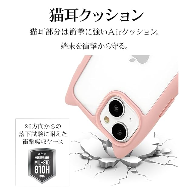 本製品はかわいい猫耳が付いたハイブリッド背面ケースです。 米軍MIL規格「MIL-STD-810H」最新の衝撃基準規格に準拠。 アメリカ国防総省で定められた、米軍調達品基準に準拠した規格で、26方向からの落下試験に耐えた衝撃吸収ケースです。 側面は弾力と柔軟性を兼ね備えたTPU素材で端末を衝撃から保護。背面は傷に強いポリカーボネート素材を使用しています。 ※衝撃吸収については、一般的なポリカーボネート製ケースと比較した自社検証結果で、無破損、無故障をするものではありません。 保護性能と装着感を追求した約1.5mmの厚めのデザイン。 側面にやわらかい素材を使用しているため着脱が簡単です。 チャーム等を取り付けることが可能なストラップホール付き。 ※本製品のストラップホールを使用する場合は、ストラップのみで宙吊りにするご使用方法はお止めください。 ケースから機器本体が外れて落下し破損や損傷等の原因となります。 ケースを装着したままカメラ機能や充電コネクターの接続、タッチパネル操作が可能です。 また各種ボタンの操作も使用可能です。 ワイヤレス充電及びMagSafeアクセサリーには対応しておりません。 ※本製品は液晶ガラスの外周まで覆う形状の為、保護フィルム等の形状によっては浮く、もしくは剥がれてしまう場合があります。 対応ガラス・フィルムをご使用の際はご注意ください。 ※ご使用のモニター環境により、実際の商品の色合いと多少異なってみえる場合がございますのでご了承ください。 ※商品及びパッケージは改良などの諸事情により予告なく変更することがあります。 iPhone2023 2眼カメラモデル6.1インチは、iPhone15対応商品です。