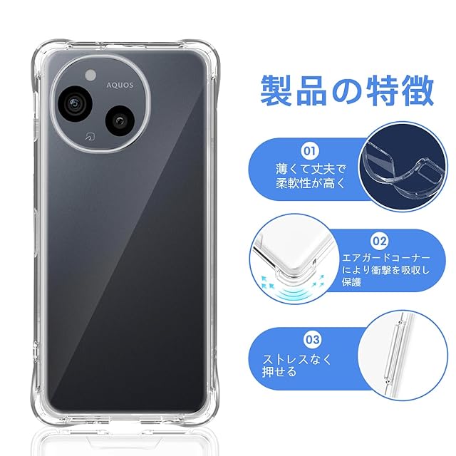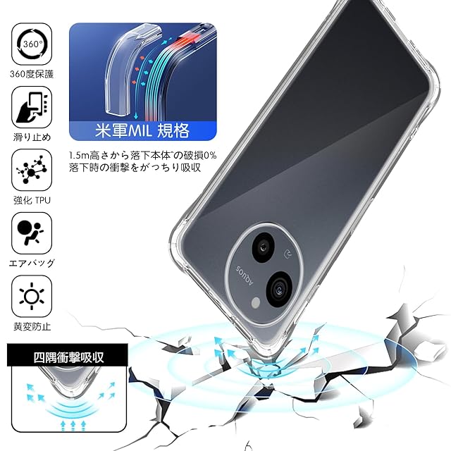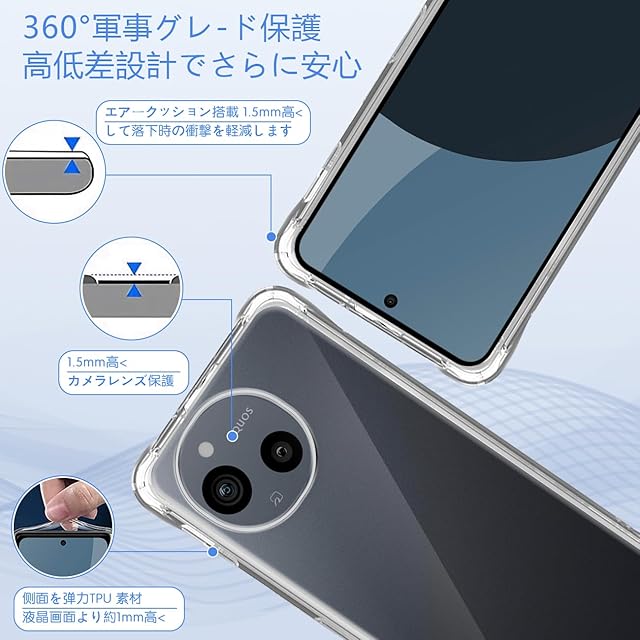 スマホが日常の生活に溶け込む現代で、落下などによるスマホの破損は販売台数に比例して増えている状況です。<br>本ケースの角には落下時の衝撃を吸収するエアポケットを備えており、万が一スマホを落としてしまった場合でも、落下時のダメージを最小限に抑えることが可能となっており、<br>その耐衝撃性能は第三者機関の試験による米軍MIL規格をクリアするほど高いことが証明されております。<br>また、AQUOS sense9 専用にオリジナル設計しているためぴったりとフィットし、保護性能には欠かせないポイントとなっています。 <br><b>【高設計】</b> <br>対応 AQUOS sense 9 本体にぴったりフィイットするよう設計し、精巧をきわめていることの孔位で。<br> 着脱も簡単で、スマホ本体への擦り傷も心配無用です。内側のマイクロファイバーライニングクロスは非常に柔らかく、電話の裏面を傷つけません。 <br><b>【高品質】</b> <br>高品質のTPU素材を採用して、磨耗に耐え、滑り止め防塵、分裂防止などの全面の保護を提供します。<br>落ちることでもたらす衝撃力を吸収できるから、壊されないケースである。 <br><b>【高い透明度】</b> <br>背面に高透明度と指紋軽減を両立した特殊TPU素材を採用、透明背面は黄ばまず。透明度が高く、本体の鮮やかな色をそのまま映し出すことができ、 スマートフォン のオリジナルのカラーを損ねません。<br>驚きほどの透明感、美しさをしっかりキープ、携帯電話本体のカラーを活かせて、背面がクリアなので好きなシールや写真を入れてカスタマイズOK、本体の美しさを引き立たせて。 <br><b>【100%安心な】</b> <br>弊社は安心交換が付きます。品物はお客様の手元に届いたら、割れたり、傷など付いていたり、<br>または通常使用で問題があると思われる場合は弊社とご連絡ください。迅速に対応し、満足のいく回答をいたします。