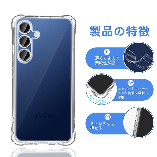 スマホが日常の生活に溶け込む現代で、落下などによるスマホの破損は販売台数に比例して増えている状況です。<br>本ケースの角には落下時の衝撃を吸収するエアポケットを備えており、万が一スマホを落としてしまった場合でも、落下時のダメージを最小限に抑えることが可能となっており、<br>その耐衝撃性能は第三者機関の試験による米軍MIL規格をクリアするほど高いことが証明されております。<br>また、ギャラクシーS25 専用にオリジナル設計しているためぴったりとフィットし、保護性能には欠かせないポイントとなっています。 <br><b>【高設計】</b> <br>対応 Galaxy S25 本体にぴったりフィイットするよう設計し、精巧をきわめていることの孔位で。<br> 着脱も簡単で、スマホ本体への擦り傷も心配無用です。内側のマイクロファイバーライニングクロスは非常に柔らかく、電話の裏面を傷つけません。 <br><b>【高品質】</b> <br>高品質のTPU素材を採用して、磨耗に耐え、滑り止め防塵、分裂防止などの全面の保護を提供します。<br>落ちることでもたらす衝撃力を吸収できるから、壊されないケースである。 <br><b>【高い透明度】</b> <br>背面に高透明度と指紋軽減を両立した特殊TPU素材を採用、透明背面は黄ばまず。透明度が高く、本体の鮮やかな色をそのまま映し出すことができ、 スマートフォン のオリジナルのカラーを損ねません。<br>驚きほどの透明感、美しさをしっかりキープ、携帯電話本体のカラーを活かせて、背面がクリアなので好きなシールや写真を入れてカスタマイズOK、本体の美しさを引き立たせて。 <br><b>【100%安心な】</b> <br>弊社は安心交換が付きます。品物はお客様の手元に届いたら、割れたり、傷など付いていたり、<br>または通常使用で問題があると思われる場合は弊社とご連絡ください。迅速に対応し、満足のいく回答をいたします。