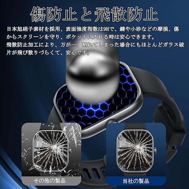 【傷防止と飛散防止】日本旭硝子素材を採用、表面強度指数は9Hで、鍵や小砂などの摩損、傷からスクリーンを守り、ポケットに入れる時は安心できます。