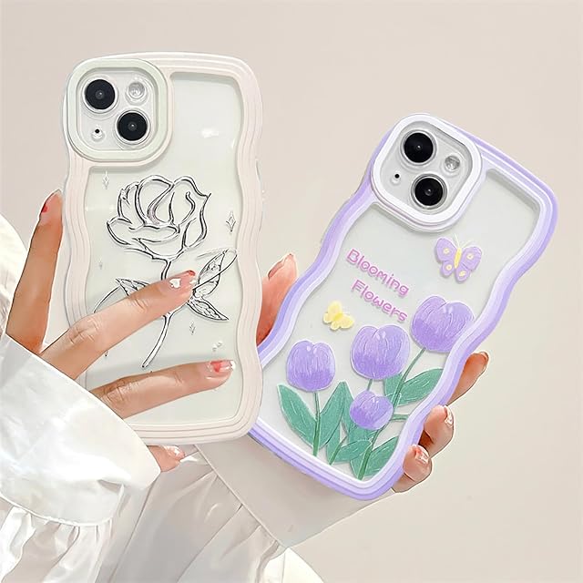 UEEBAI 対応 iPhone 15 6.1 inch 用の ケース ソフト TPU カバー 可愛い おしゃれケース 透明 ウェーブ デザイン スマホケース ワイヤレス充電対応 軽量 薄型 耐衝撃 人気 波型 バンパー スマホケース - パープル・フラワー